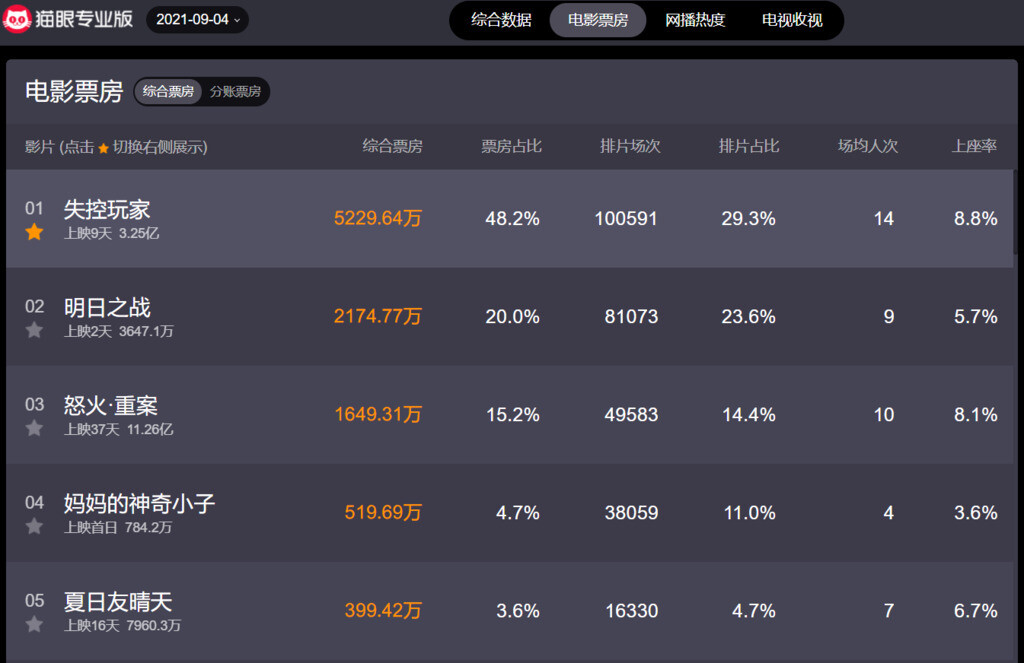 مۈشۈك كۆز ئورگان تورىنىڭ ئەڭ يېڭى سانلىق مەلۇماتىغا ئاساسلانغاندا، دۆلىتىمىز كىنو بازىرىنىڭ 9-ئاينىڭ 4-كۈنى سائەت 0:00دىن 23:59گىچە بولغان ئومۇمىي بېلەت كىرىمى 108 مىليون 370 مىڭ يۈەن بولغان.